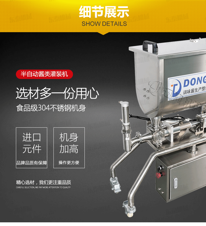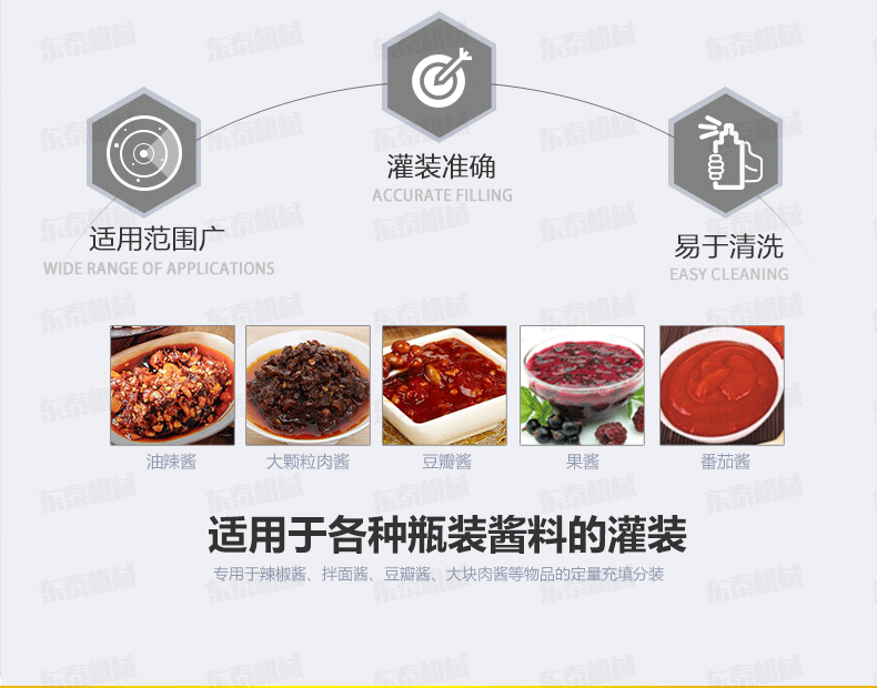 辣椒醬灌裝機 適合于將各類粘稠體及含有各種固體物質如辣椒、花生、肉塊、佐料等物體的醬類和油、料分離的火鍋底料等灌裝于各種容器中,辣椒醬灌裝機 適用于辣椒醬、顆粒醬料、大塊肉醬、火鍋底料等的灌裝。辣椒醬灌裝機 /半自動辣椒醬灌裝機可灌裝顆粒漿狀流體物料,特別適用于調味品中帶顆粒并且濃度較大的辣椒醬、火鍋底料等粘稠醬類的灌裝,配置的自動攪拌器,辣椒醬灌裝機 保證了醬和油的充分混合,又稱為辣椒醬灌裝機、花生醬灌裝機、豆瓣醬灌裝機、果醬灌裝機,芝麻醬灌裝機、粘稠醬類灌裝機、牛肉醬灌裝機。