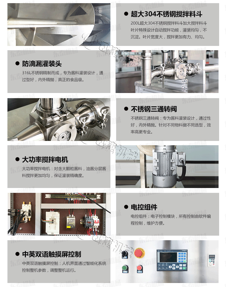 3、醬料灌裝機采用的臥式攪拌結構,醬和油可以得到充分混合,極大的提高計量的精度和灌裝性能;