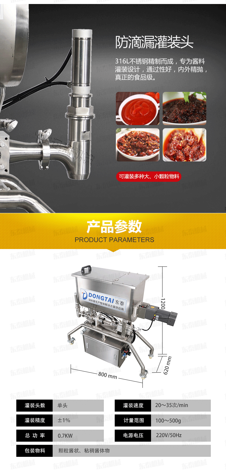 4、顆粒醬定量灌裝機主要針對食品行業的醬類分裝設計生產,香菇醬灌裝機特別適用于調味品中帶顆粒并且濃度較大的辣椒醬、豆瓣醬、花生醬、芝麻醬、果醬、牛油火鍋底料、紅油火鍋底料等物質的粘稠醬類的灌裝;