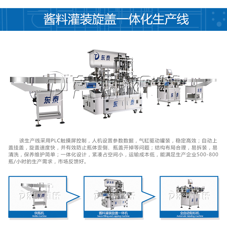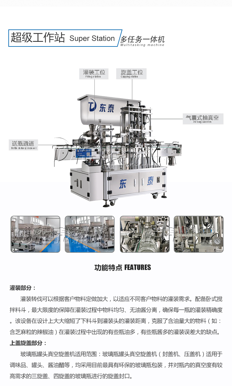 如果是瓶裝的話,可以建議使用我們的辣椒醬灌裝旋蓋一體機。在一臺機械上實現上蓋灌裝抽真空旋蓋等動作。該設備可以通過大顆粒醬料,攪拌均勻,具有灌裝精密,運行穩定可靠、工作效率高、壽命長、維護間單等特點。廣泛適用于各種含顆粒的半流體、膏體、醬料的灌裝,也可灌裝各種粘稠體等,價格方面也非常合適。