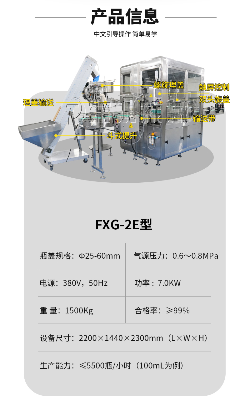 1、通用性強:適用于50-1000ml各類圓瓶、方瓶和扁壺的自動理蓋,旋蓋;