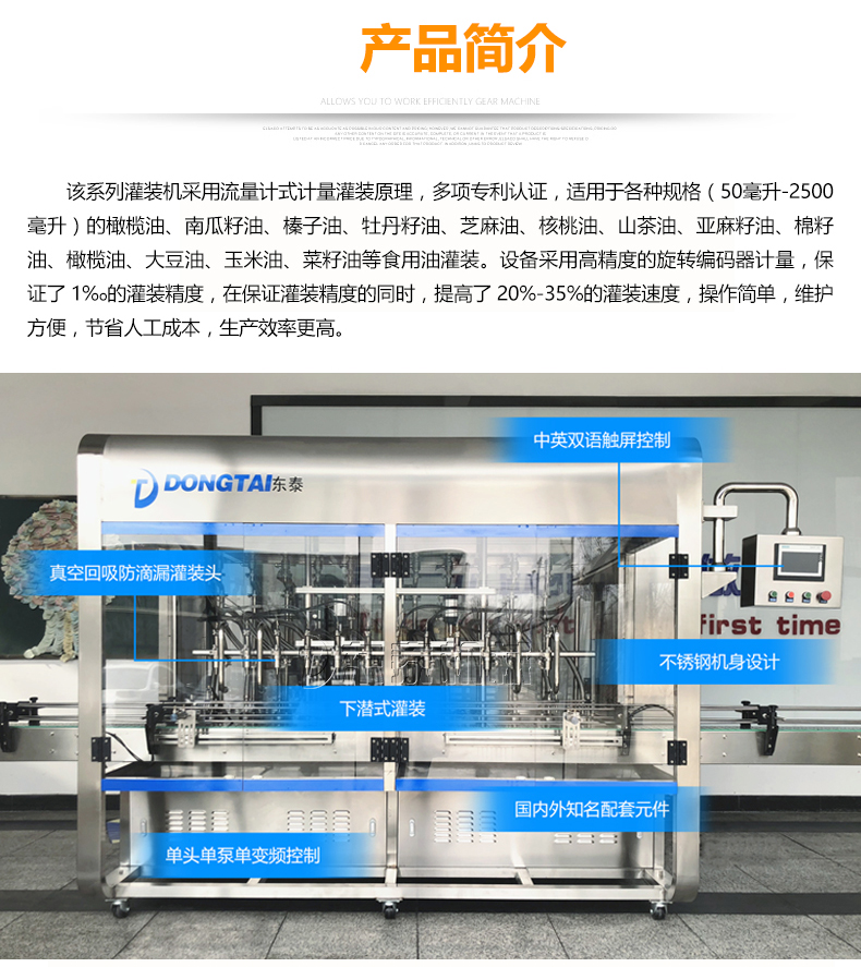 這款食用油灌裝機(jī)應(yīng)用的是流量計(jì)式計(jì)量灌裝的原理,榮獲了多項(xiàng)認(rèn)證資格,可適用各種容量(1-5升)的南瓜籽油、榛子油、牡丹籽油、芝麻油、核桃油、山茶油、亞麻籽油、棉籽油、橄欖油、大豆油、玉米油、菜籽油等多種食用油的灌裝。這個(gè)食用油選用了高精的旋轉(zhuǎn)編碼器計(jì)量,使灌裝精度保持在了1%o,在保證樂(lè)灌裝誤差的同時(shí),提高了20%-35%的灌裝速率,使用方便,維護(hù)便捷,減少了一部分的人工成本,使生產(chǎn)效率提升。除了進(jìn)桶時(shí)間,6頭灌裝機(jī),變頻器在25赫茲的速率進(jìn)行下,每組灌裝的時(shí)間為16秒,1350桶/小時(shí);